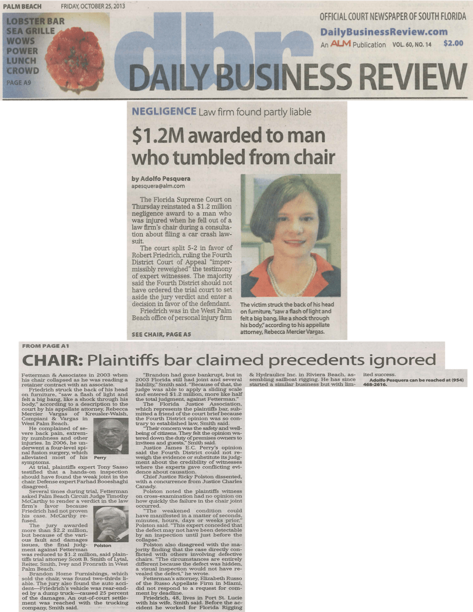 ABAJournal.com, Ex-Client in $2.2M Law Firm Chair-Collapse Case Wins Reinstatement of ‘Substantial’ Verdict, 10.29.13